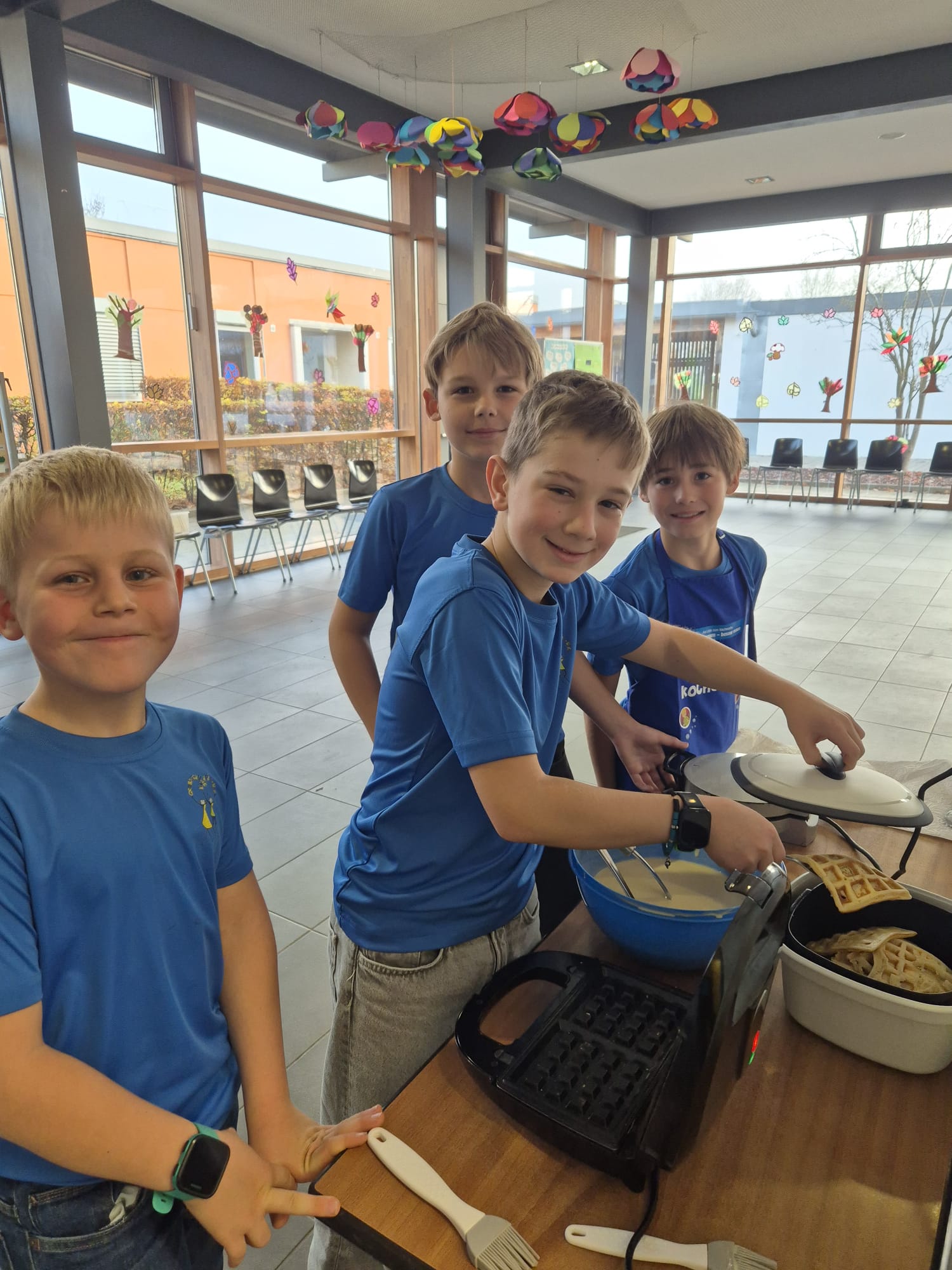 Mit großer Motivation backten die Schülerinnen und Schüler unermüdlich frische Waffeln und erfüllten das ganze Schulhaus mit einem köstlichen Waffelduft. Dank der tatkräftigen Unterstützung der Eltern konnten zusätzlich Kuchen und Muffins angeboten werden, sodass für jeden Geschmack etwas dabei war.